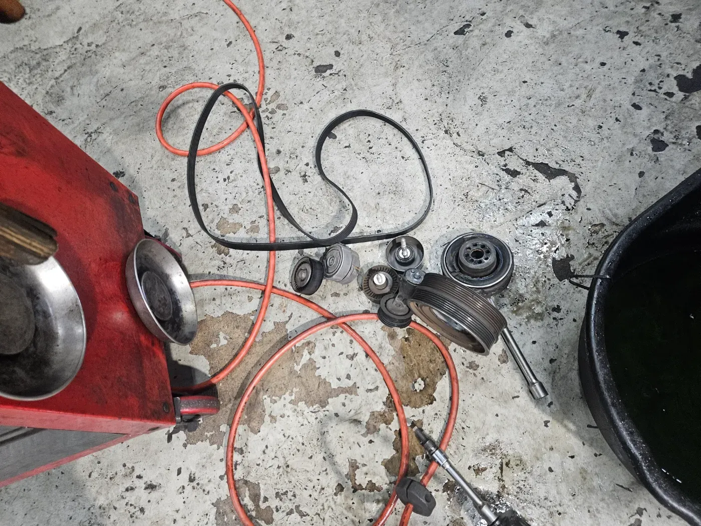 아우디 A6 TFSI 가솔린 엔진의 외부 벨트 세트 교체 작업이었습니다.