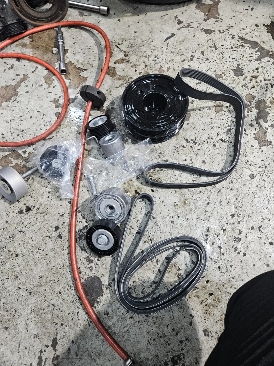 엔진 외부의 벨트, 풀리(베어링), 텐셔너 등 벨트 세트를 교체해드렸습니다. 벨트는 고무로 되어있고, 베어링은 서서히 마모가 진행되기 때문에 일정 시간이 되면 교체해주는 것이 좋습니다.