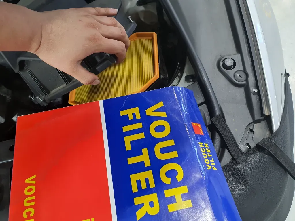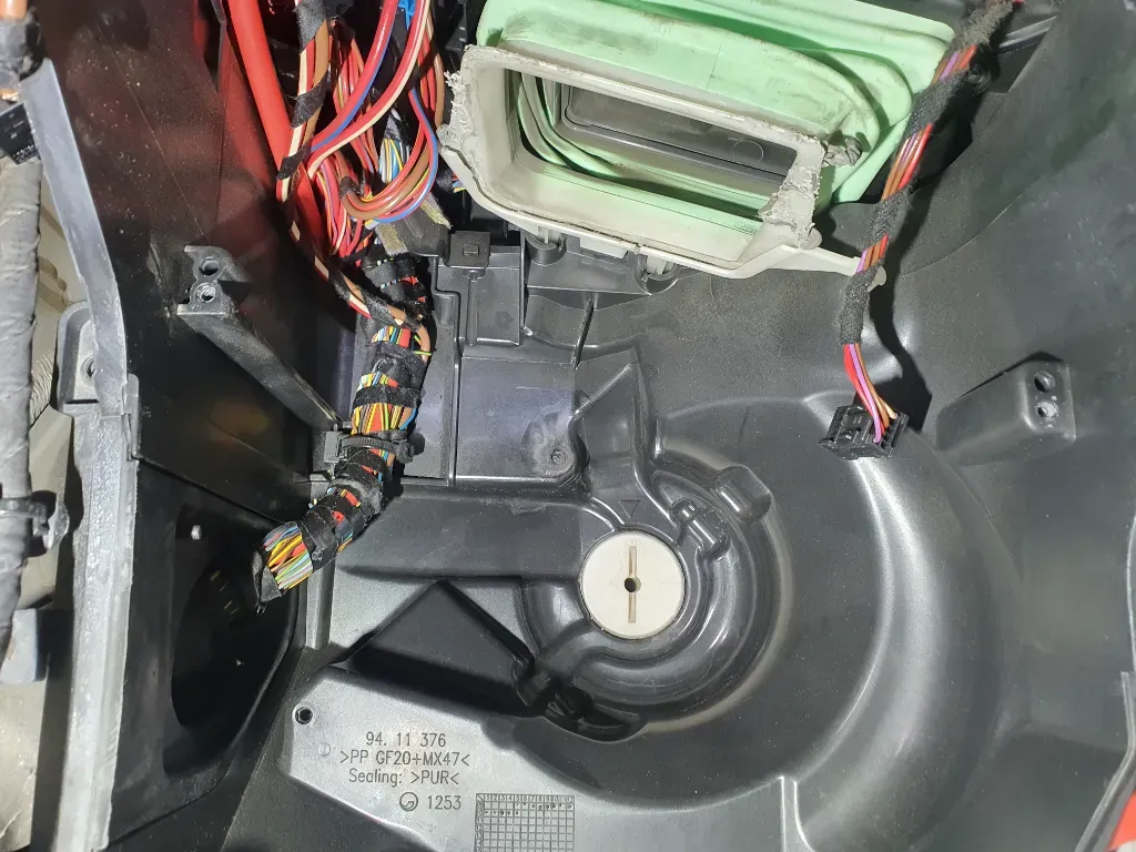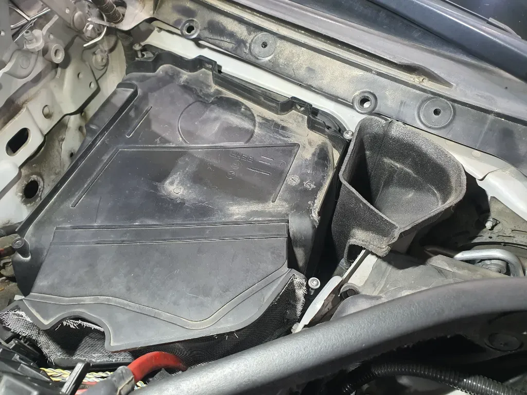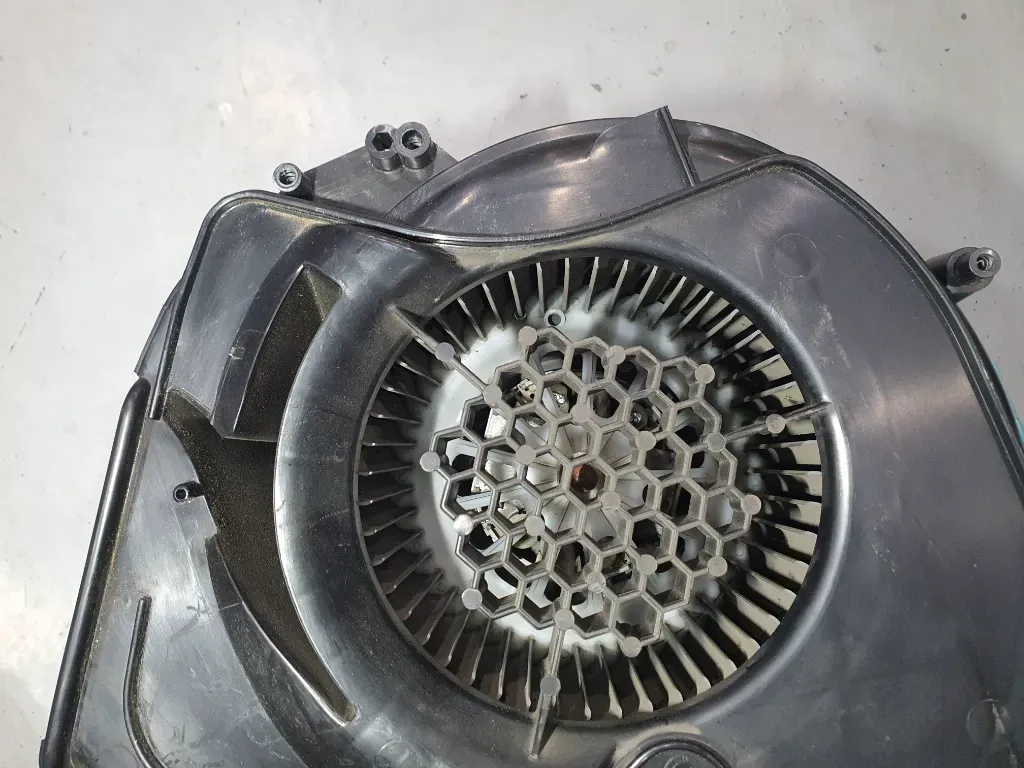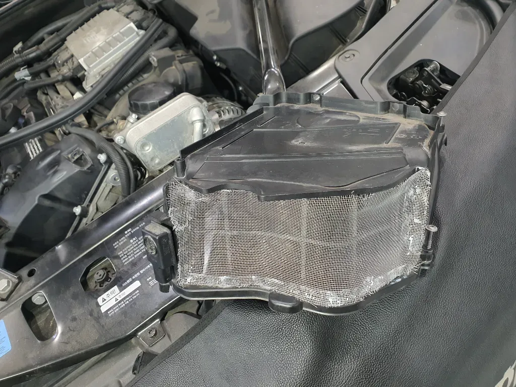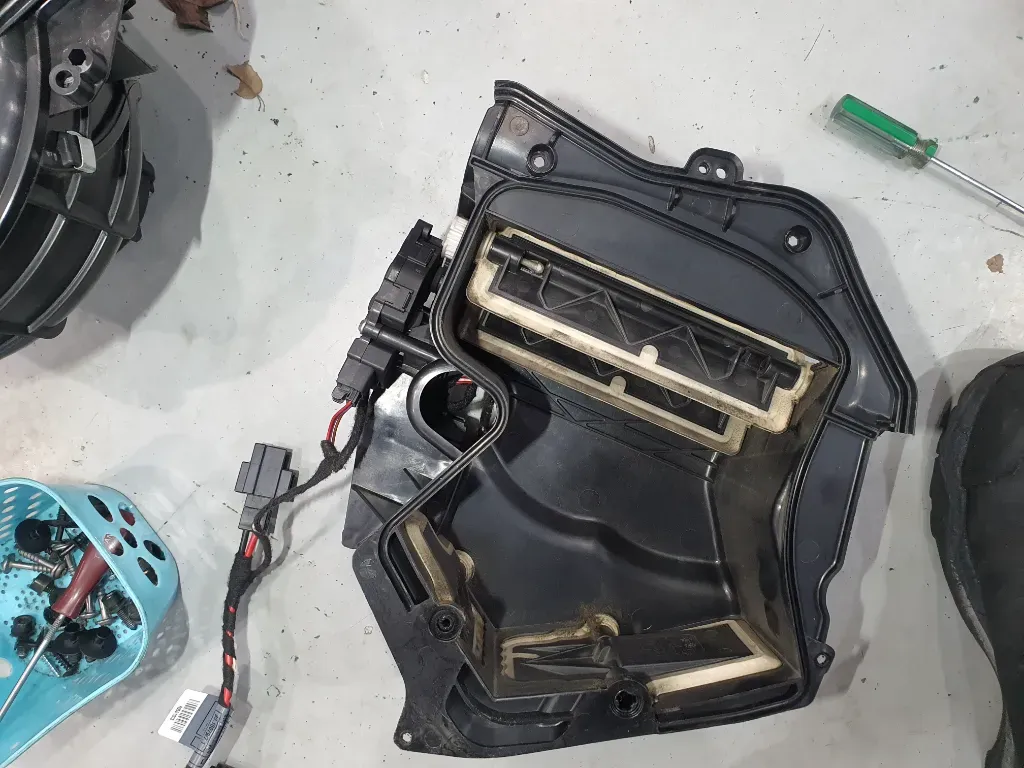 우선 에어컨 송풍기 외부의 1차 이물질 필터 손상을 수리했습니다. 송풍기 전체를 탈거하여 손상된 필터를 교체하고 단단하게 결합합니다.