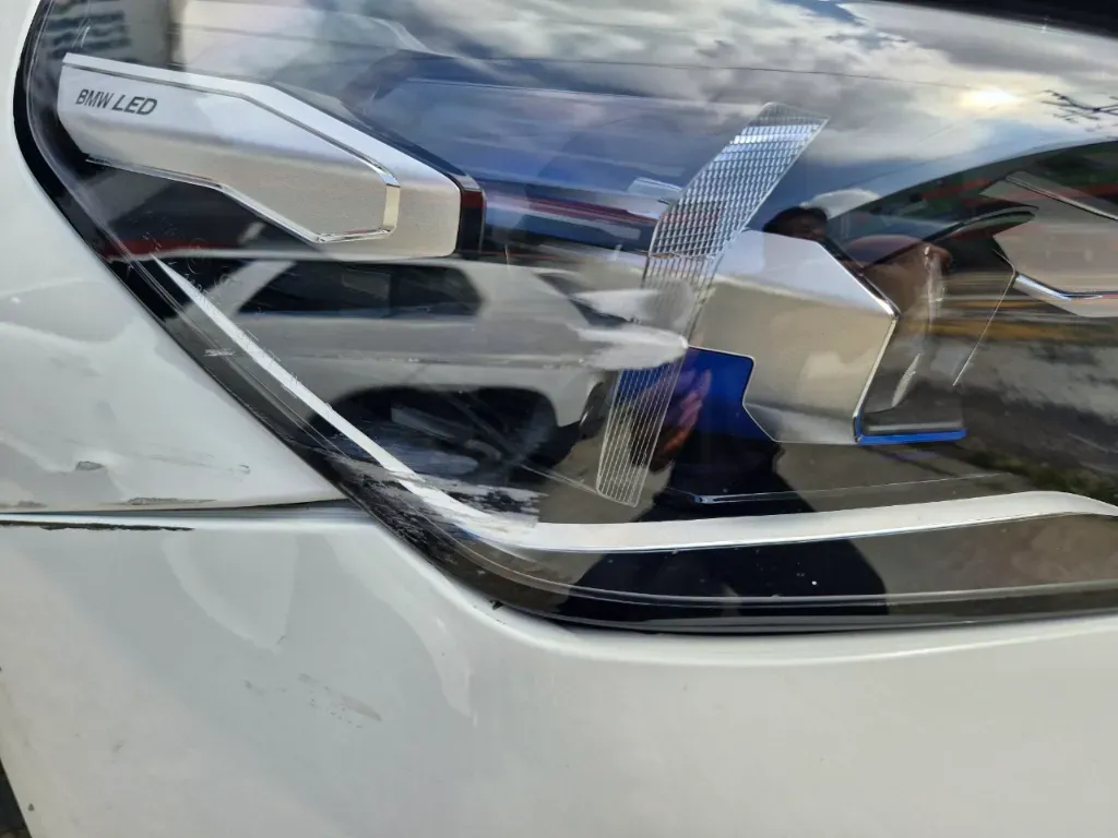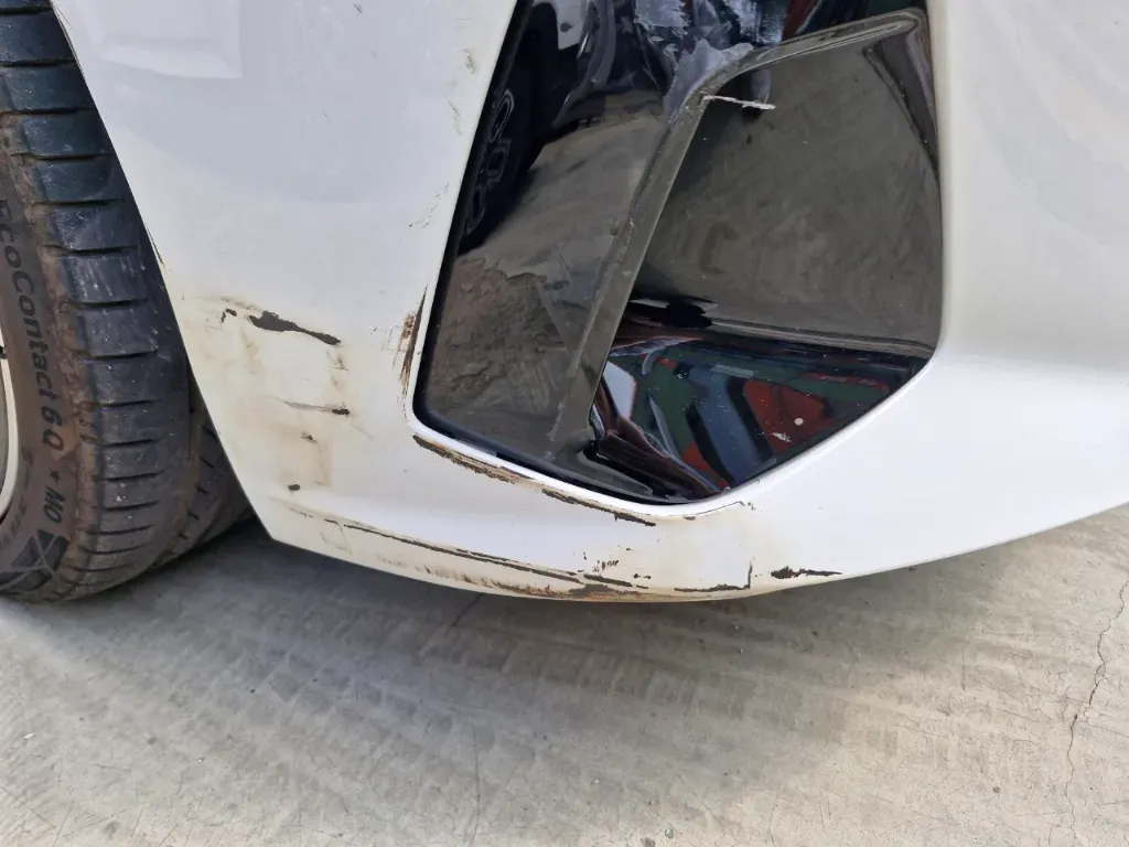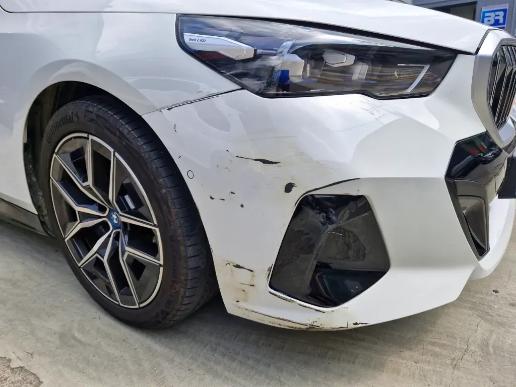 이번 BMW i5는 프론트 범퍼의 오른쪽 모서리에 사고가 생겼습니다.