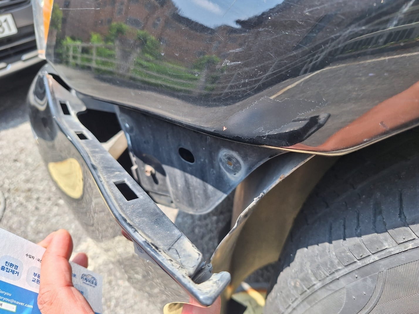 범퍼가 손상되면서 범퍼를 고정하는 브라켓(bracket)도 떨어져나왔는데 고객께서 별거 아니라고 생각해서 버리고 오신 점이 안타까웠습니다. 모든 부품들을 다 챙겨두시면 카케어포유에서 복원해드릴 수 있다는 점 미리 알려드립니다.